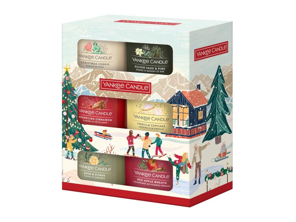 V této vánoční sadě si můžete vyzkoušet hned 6 vůní od Yankee Candle, a to: Silver Sage & Pine, Christmas Cookie, Sparkling Cinnamon, Vanilla Cupcake, Red Apple Wreath, Sage & Citrus. Jde o velmi oblíbené provedení skleněné votivní svíčky. K jejímu rozpouštění nepotřebujete svícínek a po vypálení vám zbyde hezký skleněný kalíšek třeba na čajovou svíčku. Každá voní až 10 hodin a intenzita vůně vás i při malé velikosti svíčky příjemně překvapí!
